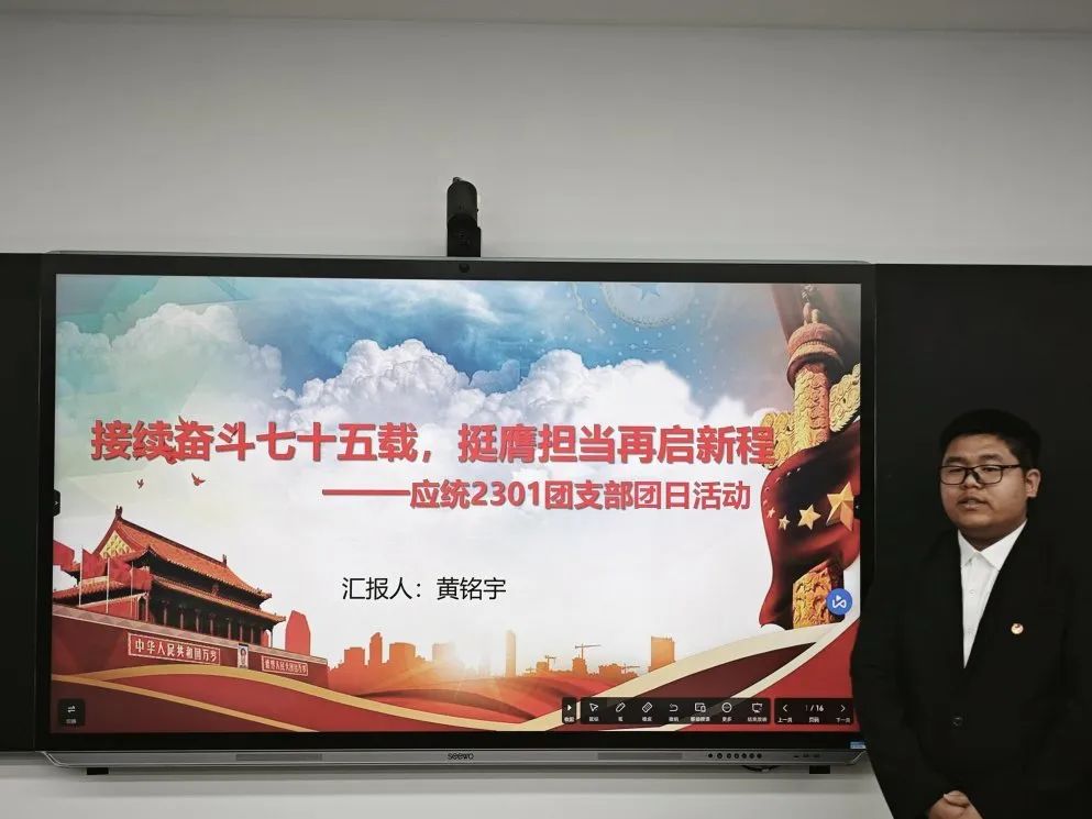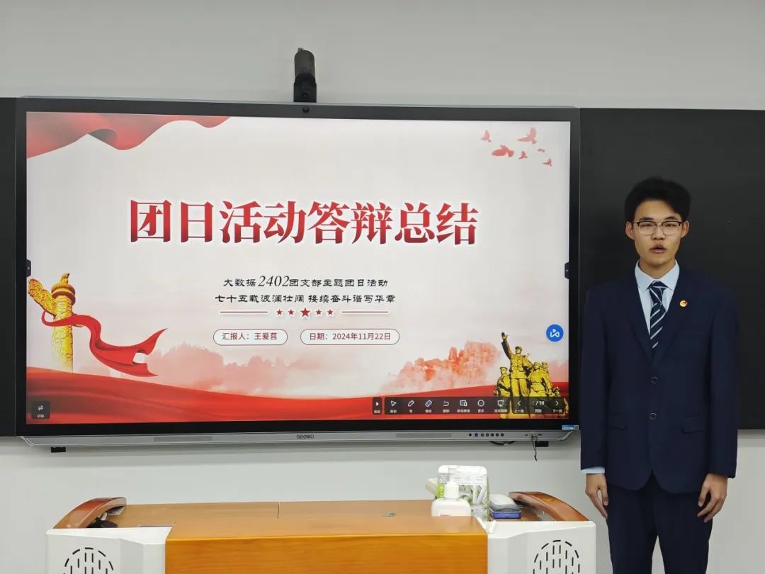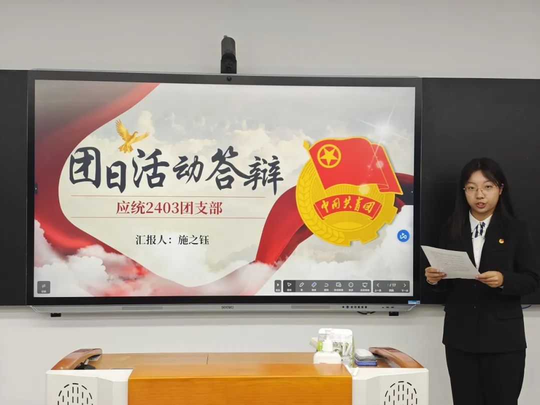 在主持人介绍答辩流程及规则后,答辩正式开始。参与答辩的27位团支部书记按照顺序依次上台展示汇报。过程中,各位团支书详细介绍了所在团支部团日活动的开展情况,充分体现了丰富多样的创意文化作品与开展过程中取得的成果经验。红色文创、知识问答、红色剧本杀、实地寻访手帐宣传海报、奋斗感悟、主题精讲团课、团支部共建回顾,公众号视频号运营,这些充实的成果内容彰显出每一个团日活动背后团支部书记与全体团支部成员的辛勤付出与协作精神。