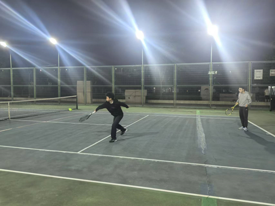 第二场是男子双打。我院蒋邵韦、马奕骋选手再度配合、技艺精湛,前半场双方势均力敌,比分打平,但我方选手接发配合默契,对面多次出界失分,我方逐渐领先,达到赛点,最终我方以6:3获胜。