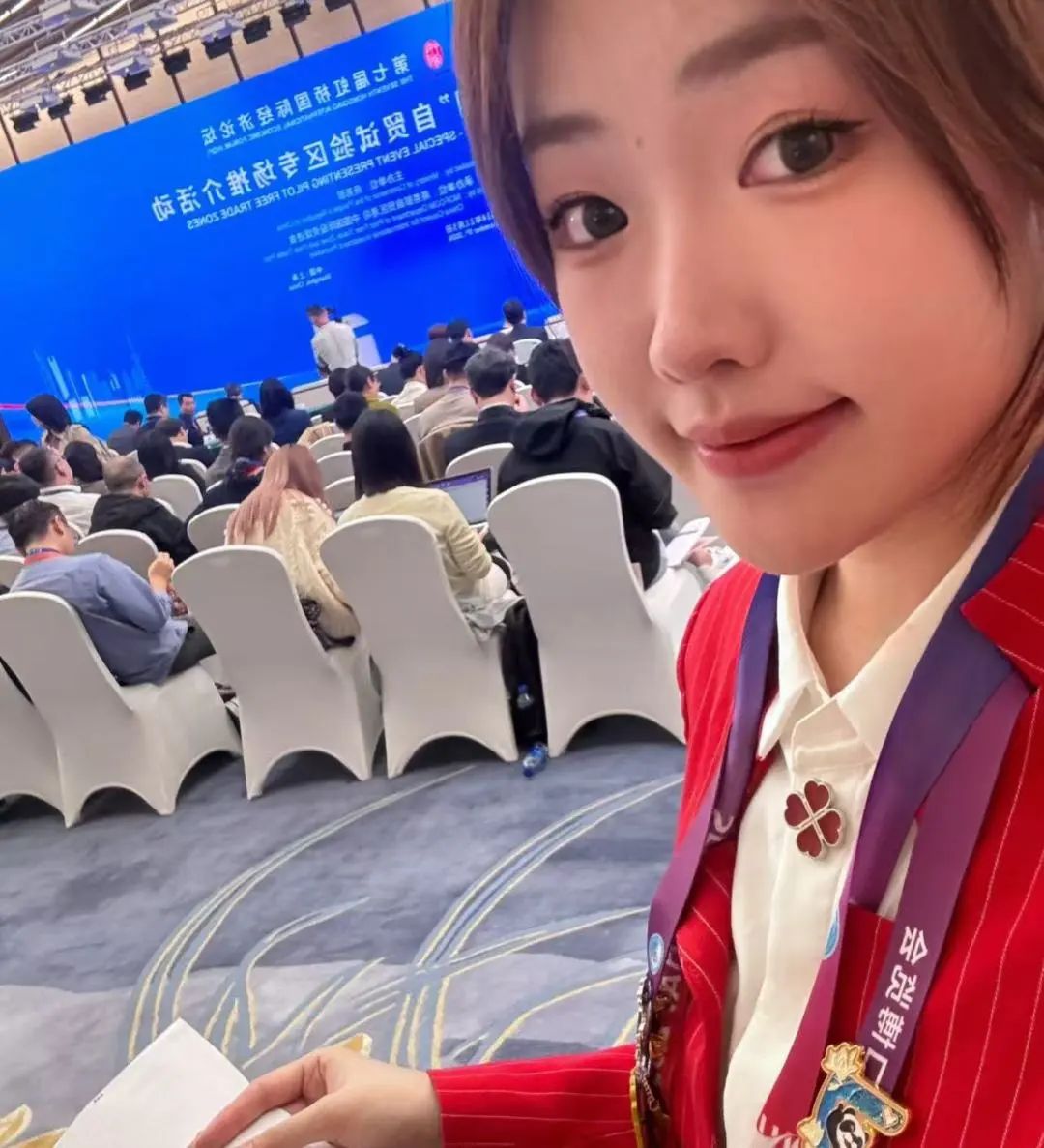 我们志愿者便是这台机器中的一颗小小的螺丝钉。在论坛开始之前,我们配合会务人员,引导贵宾进行小范围会见洽谈、引导入场、并协助完成签到等流程。负责的论坛结束之后,我们也会被分配到会员小管家的岗位,了解嘉宾和企业信息,伴随企业观展,做好引导工作。在馆内,亮眼的红西装是嘉宾们的指路牌。看着他们匆匆地来,点了点头又步履不停地去,在说出每一句“欢迎您的到来”时,我内心总感到无比的使命感和归属感。我相信,如果进博会是一座金色大厅,我们便是悬挂在这座金色大厅的闪烁星辰。