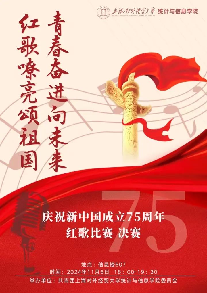 为传承红色基因,弘扬爱国主义精神,展现新时代青年的风采,在中华人民共和国成立75周年这具有重要意义的历史时刻,共青团统计与信息学院委员会现举办“红歌嘹亮颂祖国,青春奋进向未来——庆祝新中国成立75周年红歌比赛决赛”主题活动。我们将齐聚一堂,用激昂的歌声歌颂我们伟大的祖国,以悠扬的音乐共同回顾中国共产党带领人民走过的峥嵘岁月。让我们以青春之我,创青春之中国,奋进新时代,为实现中华民族伟大复兴的中国梦贡献力量!让我们携手以红歌大赛共庆建国75周年,唱响新时代的最强音!有关安排通知如下: