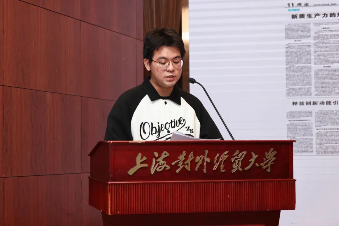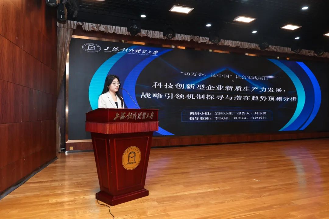 会上进行了调研队伍成果展示。统计与信息学院硕士研究生封冰悦以《科技创新型企业新质生产力发展:战略引领机制探寻与潜在趋势预测分析》为主题,介绍团队调研实施过程与分析方法,得出影响机制等结论并提出建议。统计与信息学院本科生徐楚杰以《新质生产力驱动下的新能源汽车产业链重构与增量创新路径研究》为主题,深入剖析新能源汽车行业发展,分析其受多种因素影响及变革重构情况,通过调研模型提出创新路径。国际组织学院(贸易谈判学院)本科生阳岸容以《新质生产力驱动颠覆性技术在上海高新企业的发展调查研究》为主题,交流团队调研方案实施、分析结果及心得感悟,为企业发展提供可参考的建议。