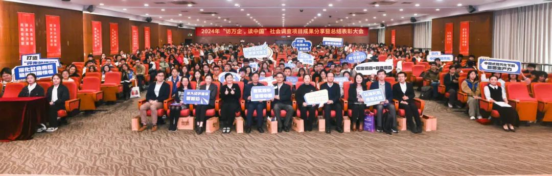 会上播放了2024年“访万企,读中国”社会调查项目回顾视频。今年的万企项目聚焦“中国式现代化下的新质生产力”主题,吸引了来自全校11个学院的200余名本硕博学生组成22支调研队伍,在60余名教师的指导下,调研科技创新与产业升级的前沿阵地,对信息技术、绿色能源、生物医药等领域的企业进行实地走访。师生与企业负责人“零距离”沟通,“面对面”交流,探究新质生产力发展影响因素,考察新质生产力对高质量发展的推动效果,为企业现代化发展提供对策建议。