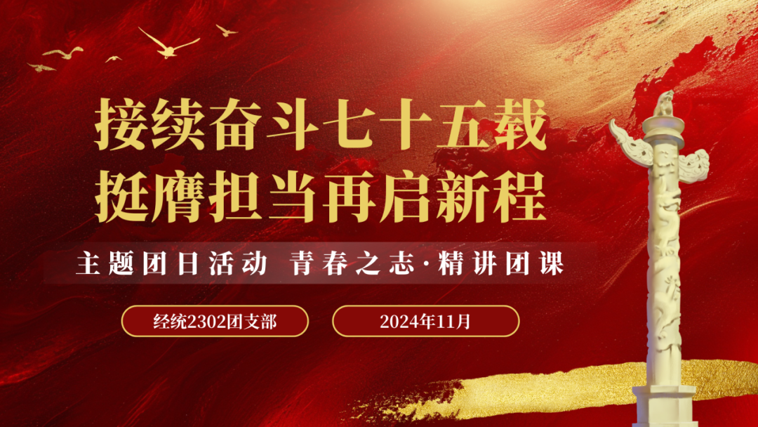 为深入学习贯彻习近平新时代中国特色社会主义思想,全面贯彻党的二十大和二十届三中全会精神,认真做好面向广大团员和青年开展学习贯彻习近平新时代中国特色社会主义思想主题教育,着力加强对共青团员政治锻造,加强对广大青年政治引领,充分激发新时代中国青年在强国建设、民族复兴伟业中挺膺担当,奋力书写为中国式现代化挺膺担当的青春篇章。经统2302团支部于2024—2025学年第一学期开展“接续奋斗七十五载挺膺担当再启新程”主题团日活动。