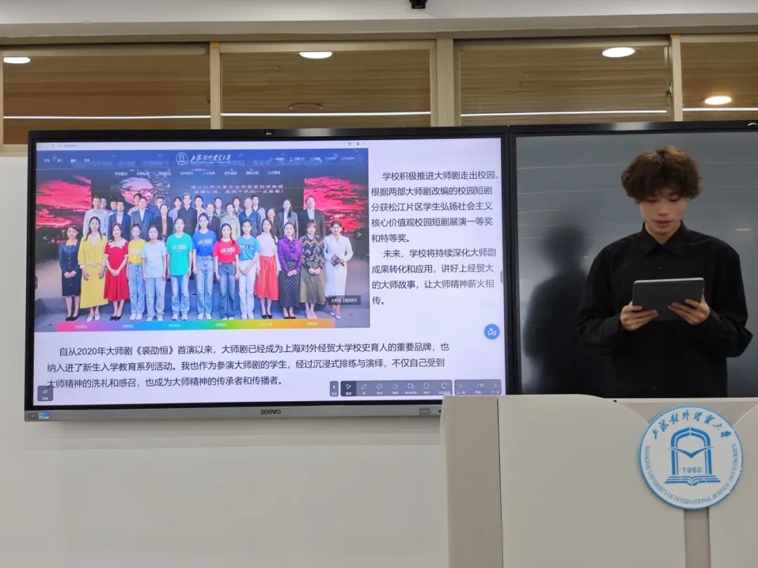 以“先锋领航新途共拓”为第二章,“校园文艺先锋”张颢严同学分享了其参演上海对外经贸大学原创大师剧《裘劭恒》的经历和心得体会,“校园实践先锋标兵”代翊群同学和大家分享了组织负责上海高校菁英汇的工作总结。二人的素质拓展分享为同学们提供了新青年全面发展的新思路。