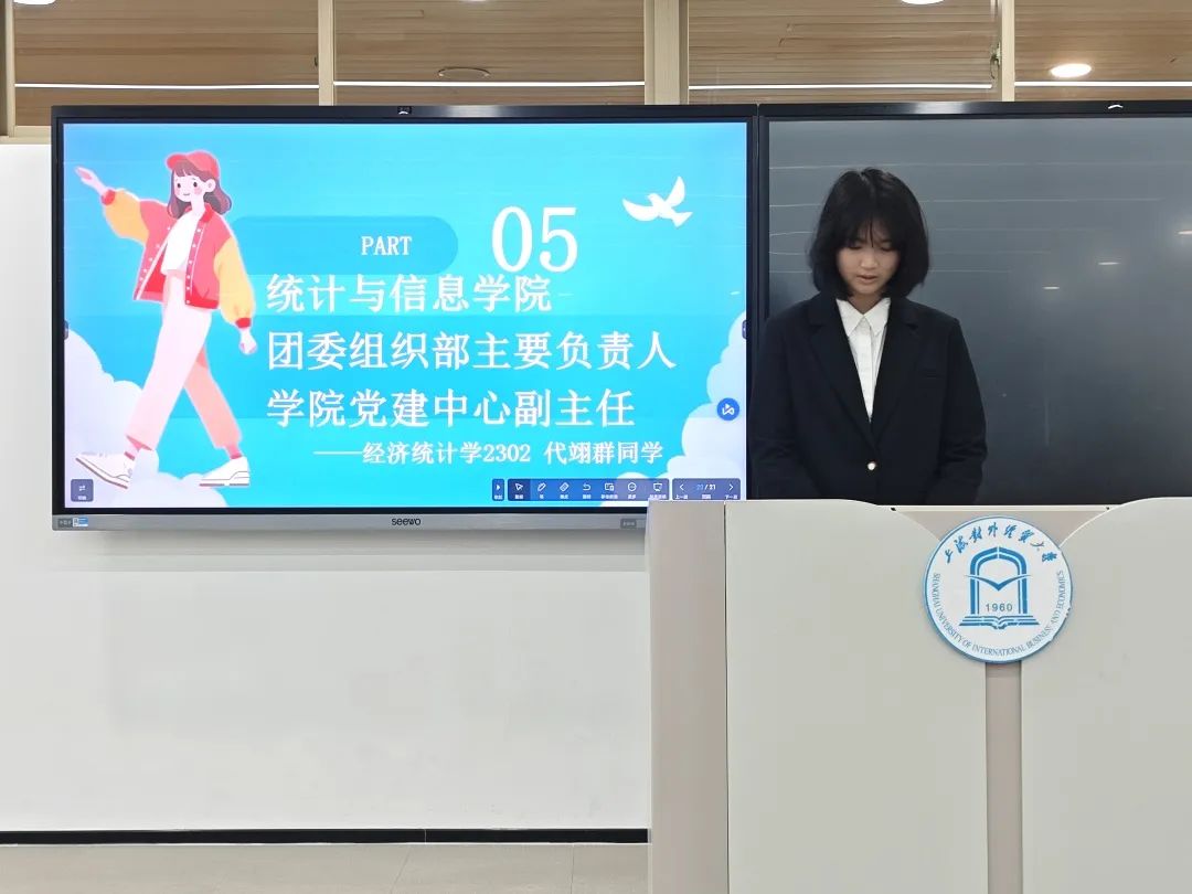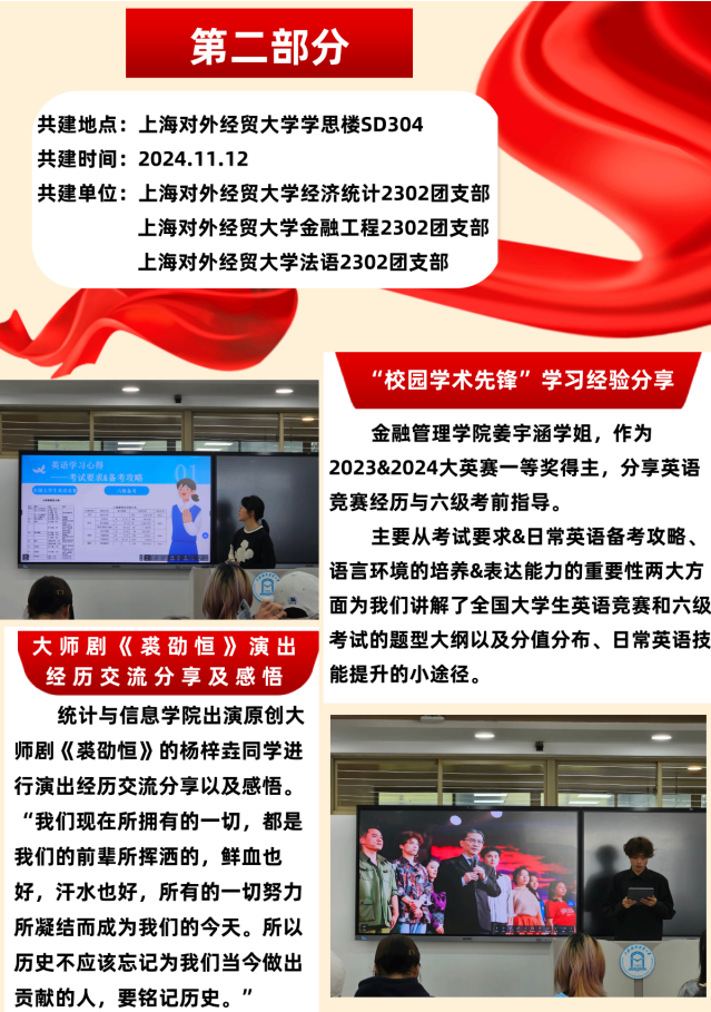 活动内容:姜宇涵学姐作为2023&2024大英赛一等奖得主,分享英语竞赛经历与六级考前指导;出演原创大师剧《裘劭恒》的经统2302团支部杨梓垚同学进行演出经历交流分享以及感悟;国际刑事模拟法庭成员陈思羽座谈交流竞赛经历;梁奕然学长分享作为优秀志愿者及2024进博会小叶子的感悟;统信学院院团委组织部部长、院党建促进中心副主任代翊群总结发言。