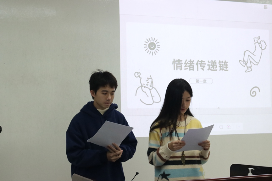 活动参与者站成一排,由第一位同学选择一种情绪,并通过表情和动作依次进行传递,完整进行一轮传递后,由最后一位同学进行猜测,成功猜对情绪即为成功。