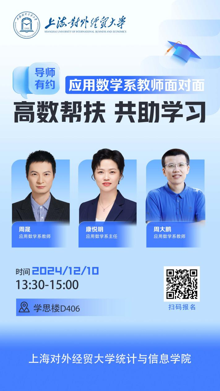 为了帮助大家更好地学习数学,上海对外经贸大学统计与信息学院现进行应用数学系教师面对面活动,为大家提供一个近距离学习和答疑的机会。