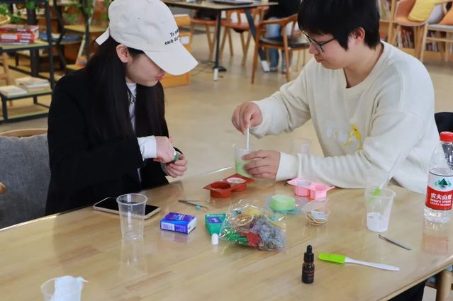 在学生志愿者的指导下,校友们仔细挑选喜爱的花瓣、颜料和香精,将薄荷、艾叶等装饰品倒入皂基,在模具里等待静置固化。通过制作樱花皂,校友们不仅感受到了手工创作的乐趣,更增添了彼此间的情谊。
