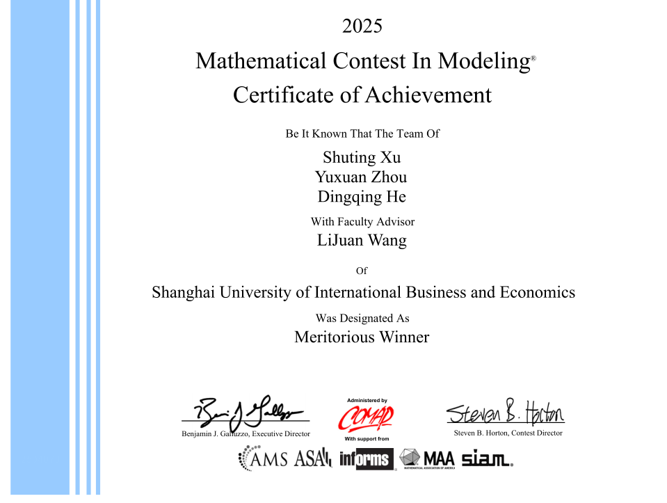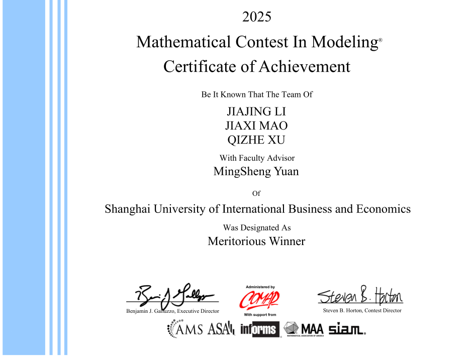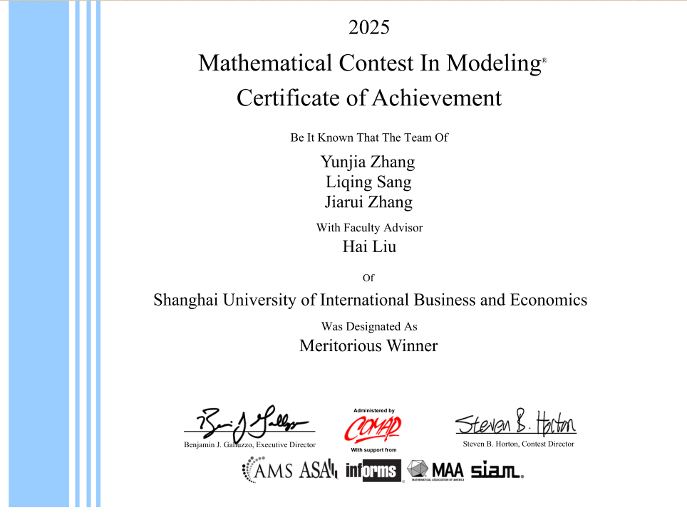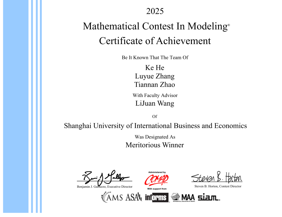 近日,2025年美国大学生数学建模竞赛(MCM/ICM)成绩揭晓,我校学生再创佳绩,荣获国际一等奖4项(Meritorious奖),国际二等奖16项(Honorable奖),国际三等奖86项(Successful奖)。