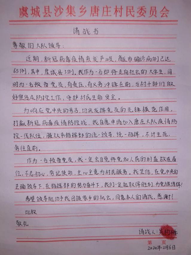 春节前夕,新冠肺炎席卷而来,牵动着众人的心。守初心、担使命,2019年底光荣加入中国共产党的会计学院学硕专业吴杨梅同学,寒假期间得知家乡河南省商丘市虞城县出现了3例新冠病毒感染的肺炎病例后,主动向村大队书记请缨,希望自己能加入到疫情防控指挥部,加入到疫情防控一线队伍,尽一名党员的绵薄之力。在按着红手印的请战书中,她写道“作为一名预备党员,我一定会自觉将党和人民的利益放在首位,不忘初心、牢记使命,全心全意为村民服务。希望能给予我回报家乡的机会,同意本人的请战!”
