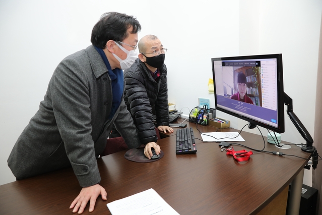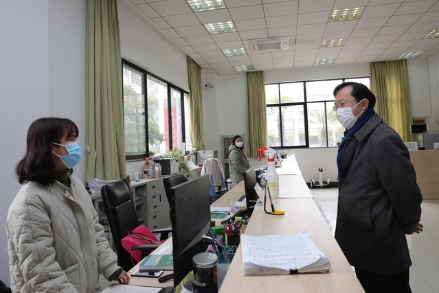 观摩课程在线教学后,汪荣明详细听取了学校在线教学整体工作情况汇报,并慰问了为在线教学提供服务保障的一线工作人员。