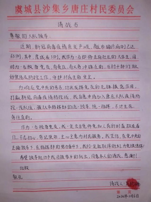 来自会计学院的吴杨梅同学,寒假期间得知家乡河南省商丘市虞城县出现了3例新冠病毒感染的肺炎病例后,主动向村大队书记请缨,希望自己能加入到疫情防控指挥部,加入到疫情防控一线队伍,尽一名党员的绵薄之力。在按着红手印的请战书中,她写道“作为一名预备党员,我一定会自觉将党和人民的利益放在首位,不忘初心,牢记使命,全心全意为村民服务。希望能给予我回报家乡的机会,同意本人的请战!”