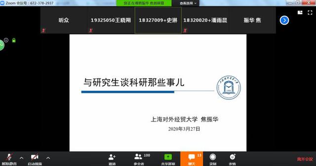 3月27日晚,云上“师说”——研究生学术系列首场讲座在ZOOM平台正式推出。本期活动由校党委研工部联合校学业发展中心共同推出,邀请导师从科研、学术资源使用以及多学科视角,理论联系实际,帮助学生拓宽学术视野、掌握研究方法、以学科思维思考社会热点问题。首场讲座邀请到国际经贸学院焦振华教授就“科研那些事儿”这一主题为学生做了在线指导,讲座吸引了300余名学生踊跃参与。