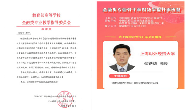 近日,我校教师张铁铸教授受邀参加全国“金融类专业骨干师资教学提升训练营”线上教学能力提升系列课程的直播授课,主讲了“《财务报表分析》翻转课程教学实践”,并在中国大学MOOC上线。据统计,有12000余名国内高校的教师和学生参加了系列直播课程,课程受得到了广大教师和学生的高度评价。课程结束后,教育部高等学校金融类专业教学指导委员会秘书处向学校发来感谢信。