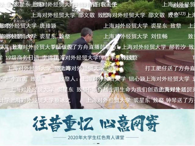 这堂课由马克思主义学院党总支书记、院长秦淑娟和龙华烈士纪念馆馆长薛峰共同主持。直播课从庄严肃穆的祭扫仪式开始,无名烈士墓前熊熊燃烧的长明火前,礼兵代表全校师生向为民族解放而牺牲的烈士们、向此次在抗击新型冠状病毒肺炎战役中殉职的英雄们,敬献花篮。校党委副书记、副校长祁明代表上海对外经贸大学全体师生宣读祭文,并代表全校师生向无名烈士墓三鞠躬。一瞬间同学们的致敬将直播间屏幕刷屏,每一个名字后面都是我校莘莘学子向英雄们致敬的心意。