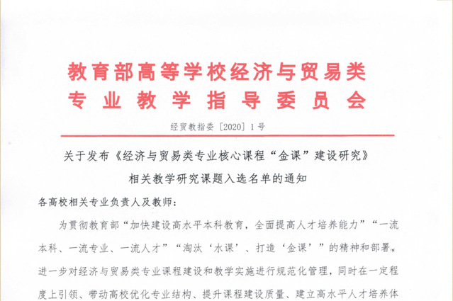 近日,经教育部高等学校经济与贸易类专业教学指导委员会组织专家评审,我校国际经济与贸易专业申报的“国际经贸大变局中国际经济与贸易专业人才培养方案改革研究”、“建设贸易强国背景下《中国对外贸易》金课建设研究” 和“建设贸易强国背景下《国际贸易实务》金课建设研究” 3个项目入选“经济与贸易类专业核心课程金课建设研究”资助。此次发布的研究课题是教育部经济与贸易类专业教学指导委员会首批“金课”建设项目,来自全国28所本科院校的32个项目入选。