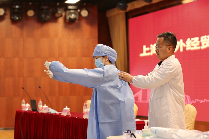 黄新军作“来沪人员健康筛查和重点人员隔离健康观察”专题讲座,介绍了集中隔离医学观点工作要求和细则、个人防护用品分类选择等内容,并在现场演示和详细解说防护服穿脱步骤和注意事项。