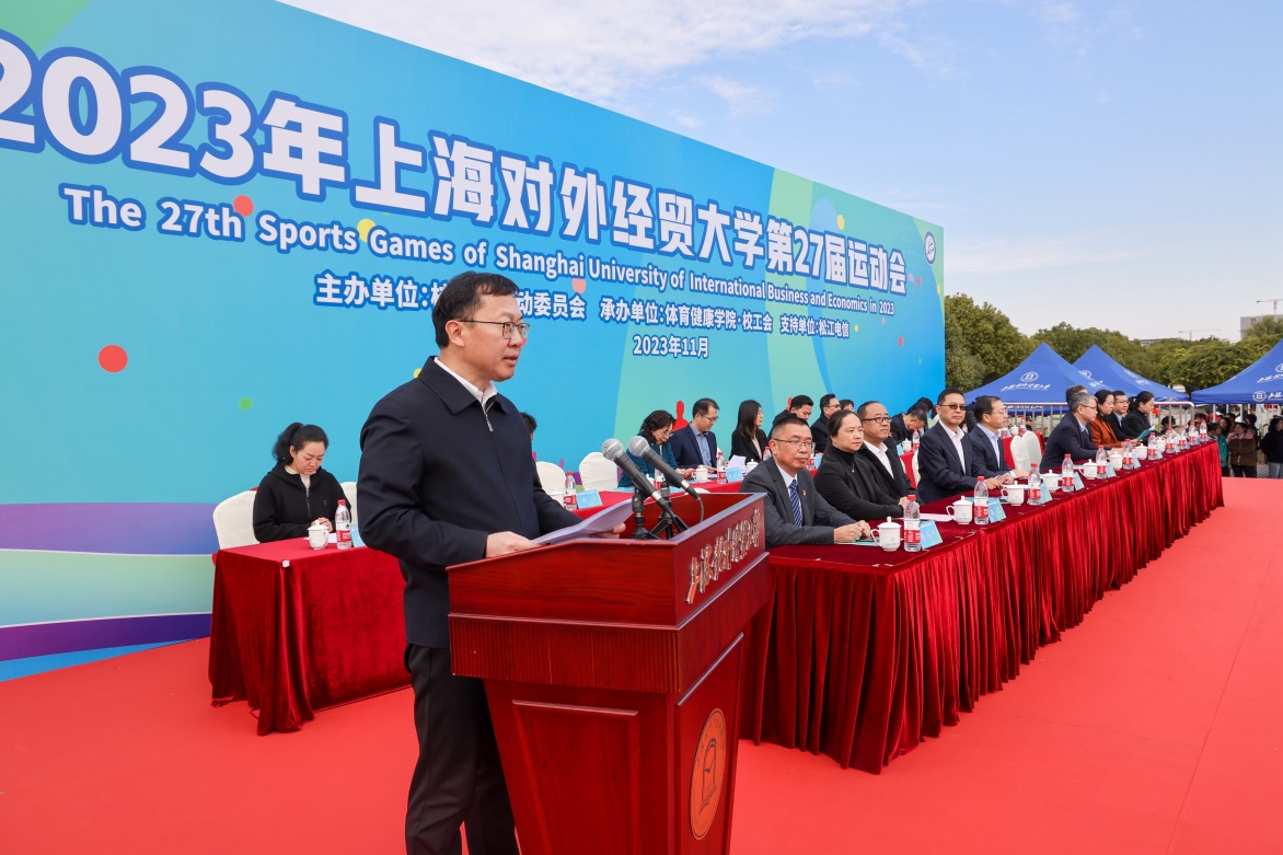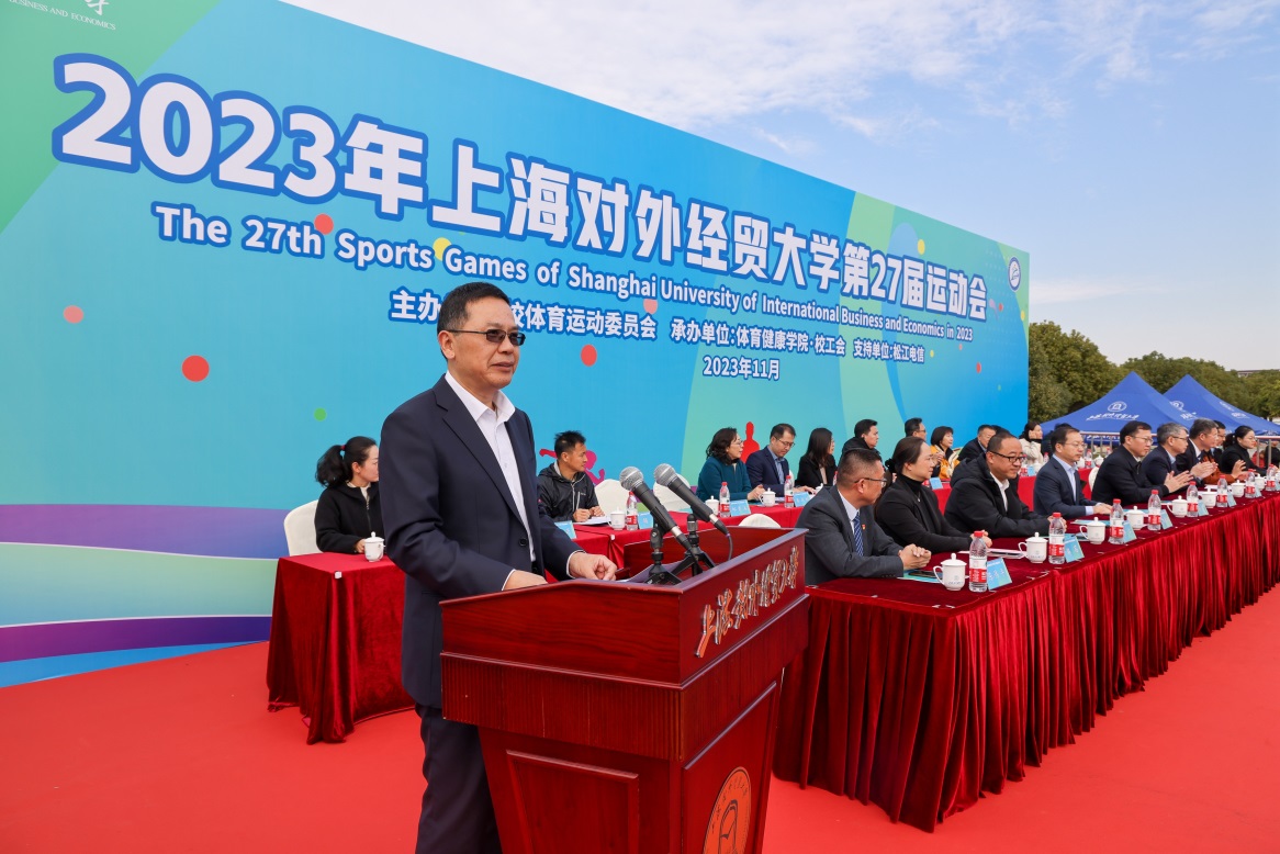 体育强则国强,国运兴则体育兴。11月14日,上海对外经贸大学迎来了第27届运动会的盛大开幕。初冬的寒意挡不住上经贸大人迸发的热情,校领导、教师和学生运动员齐聚运动场。校长汪荣明,校党委副书记、副校长祁明,校党委副书记吴毅,校党委副书记、纪委书记章益国,副校长、校体育运动委员会主任徐永林,副校长于雪梅,松江区体育局党组书记、局长李江,上海对外经贸大学附校校长陈伟平,松江大学城各兄弟高校体育部领导以及学校各学院的负责人出席本次开幕式。徐永林主持开幕式。