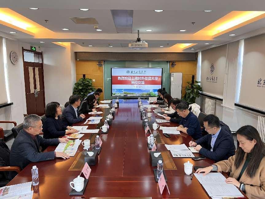 郭建华代表学校对上海对外经贸大学一行的到来表示热烈欢迎,并结合宣传片介绍了学校的历史沿革、目标定位,以及近年来学校在人才培养、学科建设、科学研究、社会服务等方面取得的成绩。他指出,学校已经确立了1个高水平研究型大学的办学定位;拥有阜成路校区及良乡主校区的2校区办学条件;坚持3个转变,即围绕服务国家和首都经济社会发展需求转型、持续做好从应用型向研究型转变、实施教育数字化转型发展战略;成立了经管学部、轻工与食品学部、数据科学与人工智能学部以及人文社科学部4个学部。希望两校相互支持、荣辱与共,推动实现共同进步。