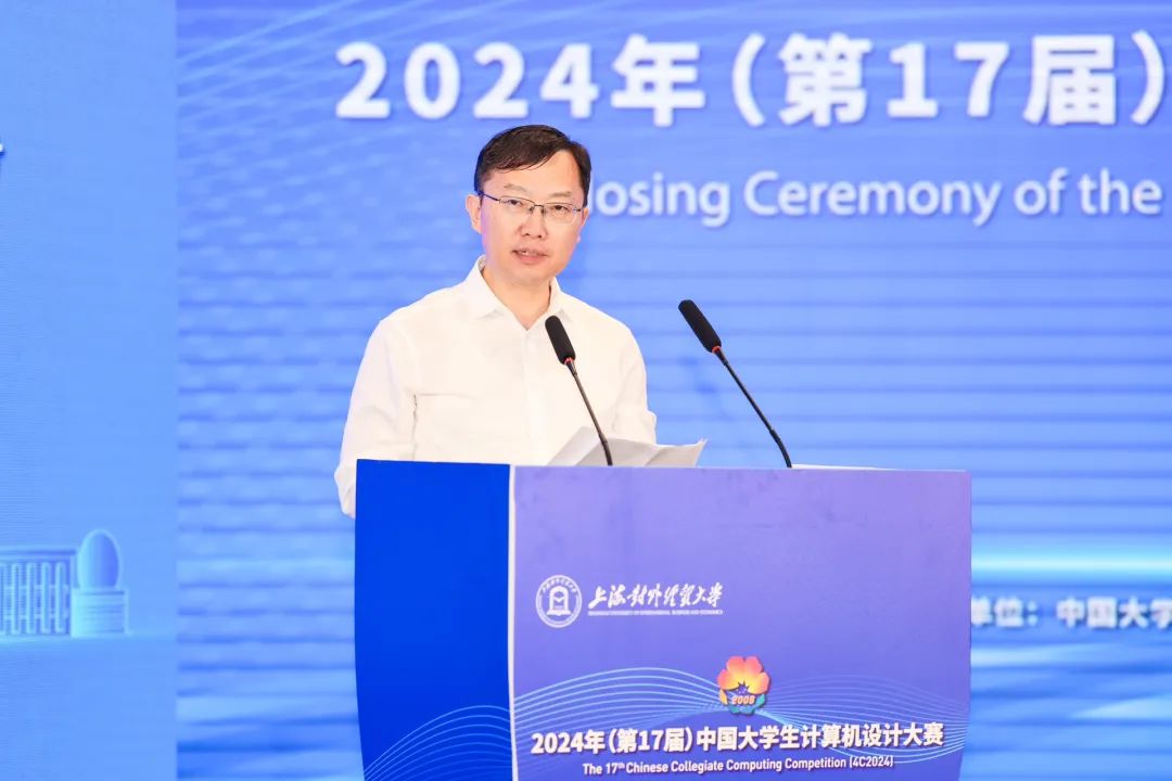 汪荣明校长代表承办方上海对外经贸大学致辞。他诚挚感谢大赛组委会对学校的信任和支持,感谢组委会领导、评审专家、工作人员和志愿者的指导和奉献,并向所有获奖师生表示祝贺。他介绍了学校的办学历史和办学特色,指出,党的二十届三中全会对深化教育科技人才体制机制一体改革作出了重要部署,学校近年来主动对接新一轮科技革命与产业变革,深化人才培养模式创新与实践教学改革,加强数字技术与贸易、金融、管理等学科专业的交叉融合,大力发展数学、统计、计算机等数据科学学科群的发展。他表示,中国大学生计算机设计大赛在推动全国高校计算机教育教学和学科竞赛的创新发展等方面作出积极贡献,对数字化、智能化时代的人才培养具有重要意义,通过承办本次大赛学校得到了学习交流的机会,未来希望与大赛组委会、全国高校和行业企业一起密切合作,不断创新人才培养模式,为强国建设培养更多拔尖创新人才。