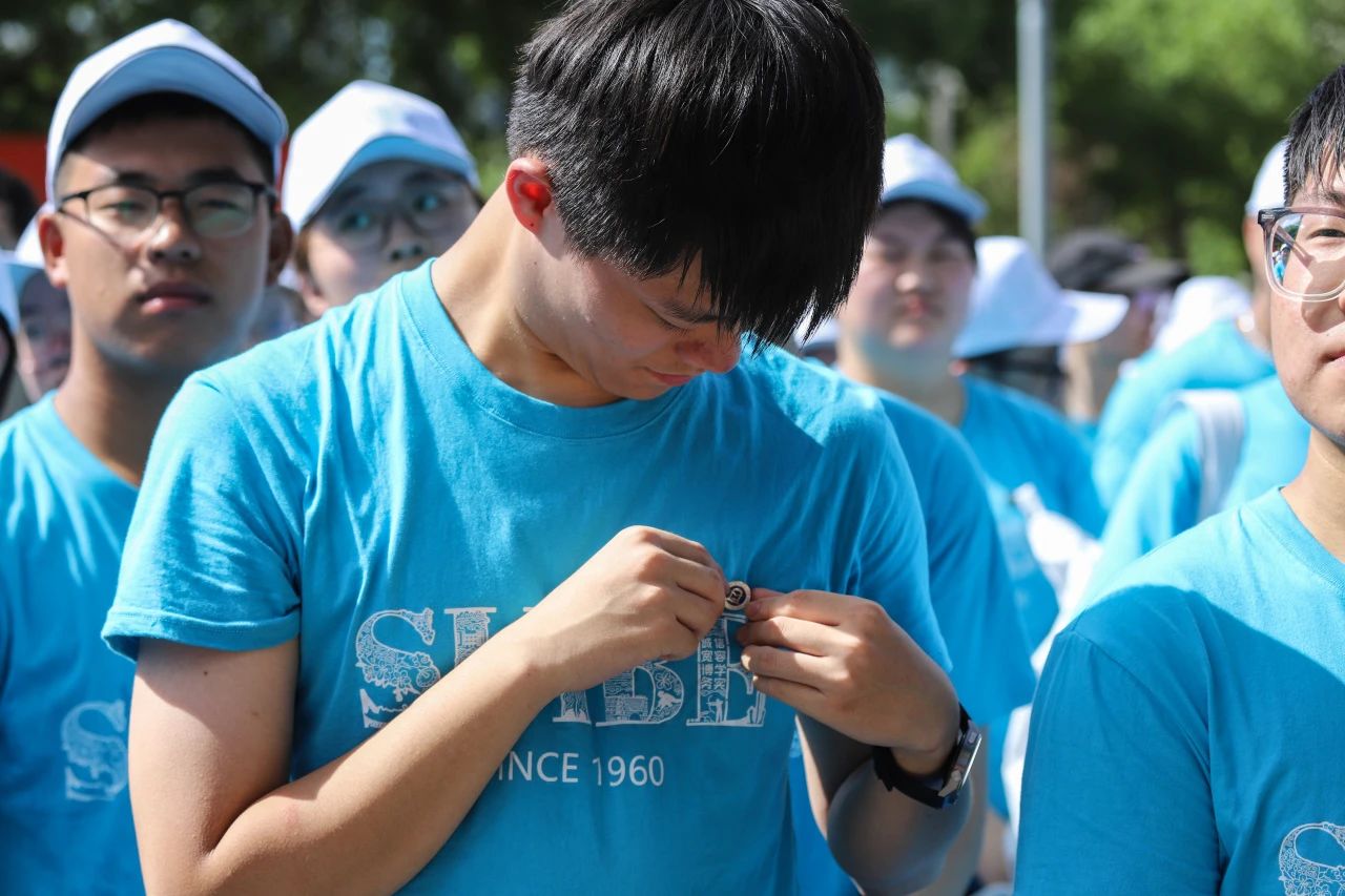 经天纬地、报国强国,上经贸大精神熔铸于校徽之中。典礼上,主席台领导为新生代表赠送了校徽和校史。全体新生集体佩戴校徽,这一刻正式成为上经贸大人,心中涌出无限自豪,也更加坚定了挺膺担当的青春志向。