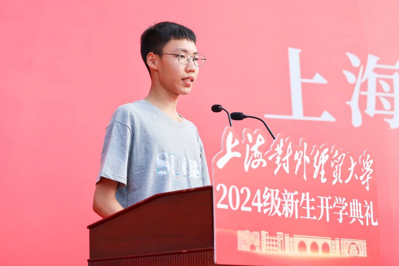 会展与传播学院苏徐城同学代表研究生新生发言,“步入研究生阶段,我们要以诚为先、以宽予人、以学为基、实干为本,笃行不怠,在上经贸大进一步锤炼本领、筑牢根基,成长为堪当民族复兴大任的时代新人。”