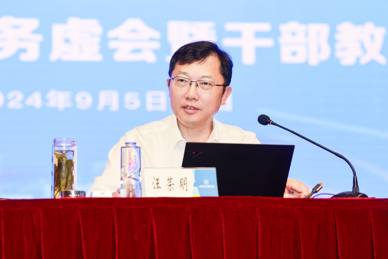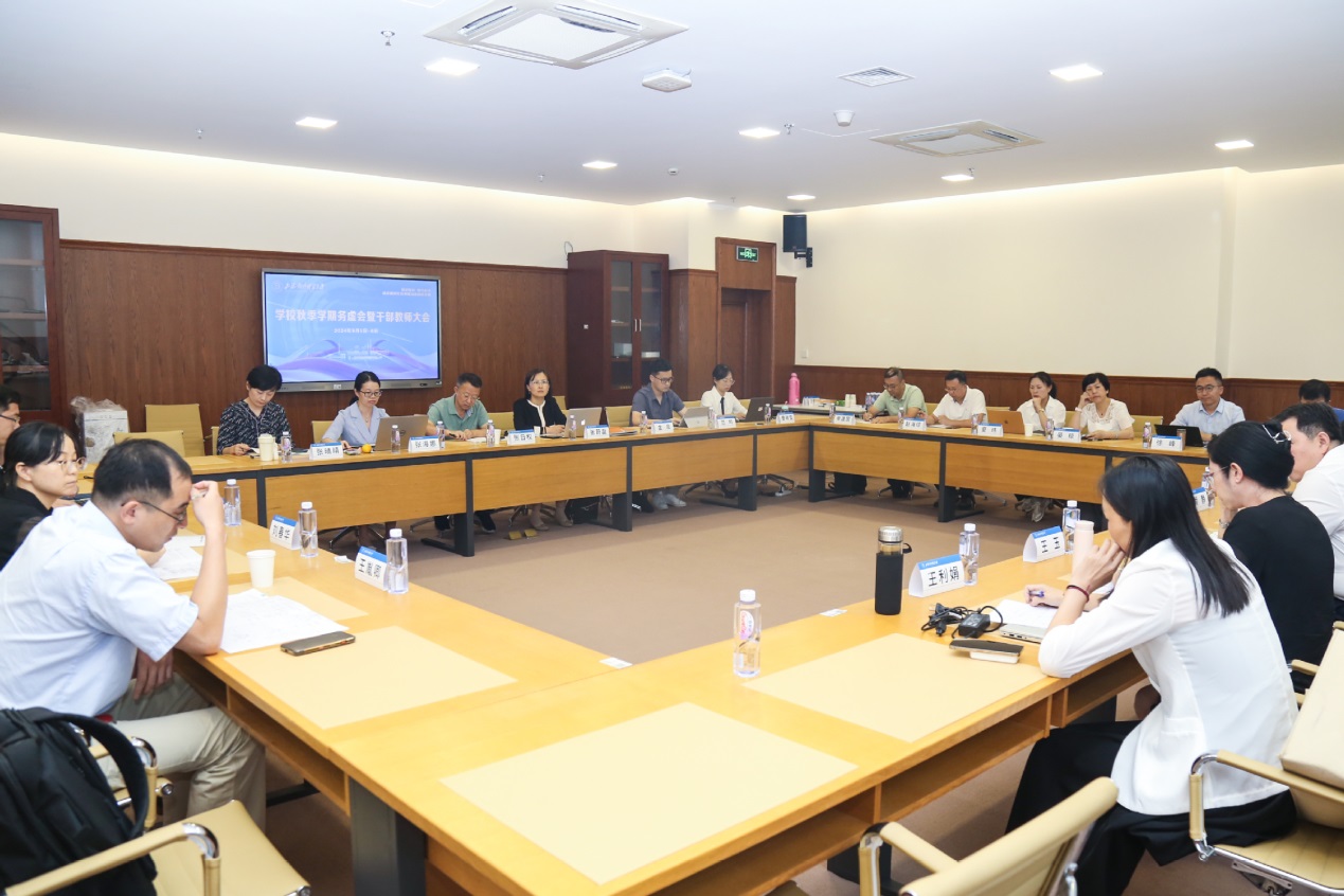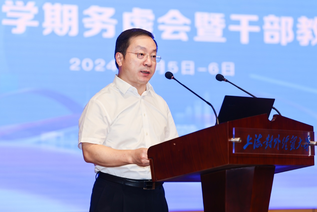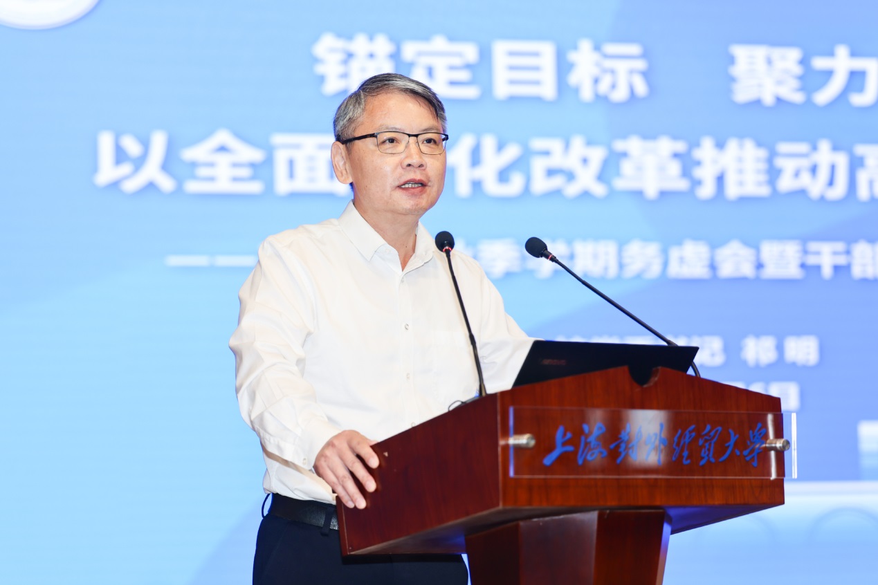 汪荣明在动员讲话中代表学校对大家在酷暑里坚守岗位、辛勤付出表示慰问,对广大干部教师为学校近年来发展作出的贡献表示感谢。他阐述了此次会议召开的背景和意义,分析了学校面临的形势和任务,表示要“上看下看、左看右看”,把握国情、吃透市情、紧跟社情、结合校情,明确学校改革与发展的重点任务。“往上看”就要把握好国情和市情,深入学习贯彻党的二十届三中全会精神,深刻认识统筹推进教育科技人才体制机制一体改革和学科专业供给侧改革等部署要求。“往左右看”就要把握好社情,深刻认识人工智能作为新一轮科技革命和产业变革的重要驱动力,对高等教育产生的巨大影响。“往下、往里看”就要精准把握校情,在总结经验的基础上加快创特色、争一流的步伐,在上水平、强特色、推进治理体系和治理能力现代化等方面持续发力。围绕推动具体工作,汪荣明提出要做到“围绕一个目标”,即:围绕学校党代会提出的“建设世界知名、国内一流、特色鲜明的高水平财经类大学”的奋斗目标。要念好“高”“特”“新”三本经,强化高水平学科建设,推动高水平、特色化科研和高质量、特色化、国际化人才培养,紧盯新技术,以人工智能赋能教育教学和行政管理工作,在人工智能大模型应用领域进行有力探索。要“练就五项基本功”,面对复杂棘手矛盾,要敢于迎难而上;面对改革中的两难多难矛盾,要敢于拍板、协调;面对碰到的新情况新问题,要勇于变革、勇于创新;面对长期性持续性改革任务,要保持强大韧性和高度专注;面对跨部门跨层级跨领域改革事项,要跨前一步,主动作为。