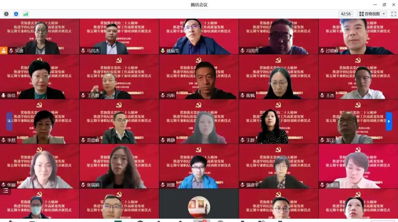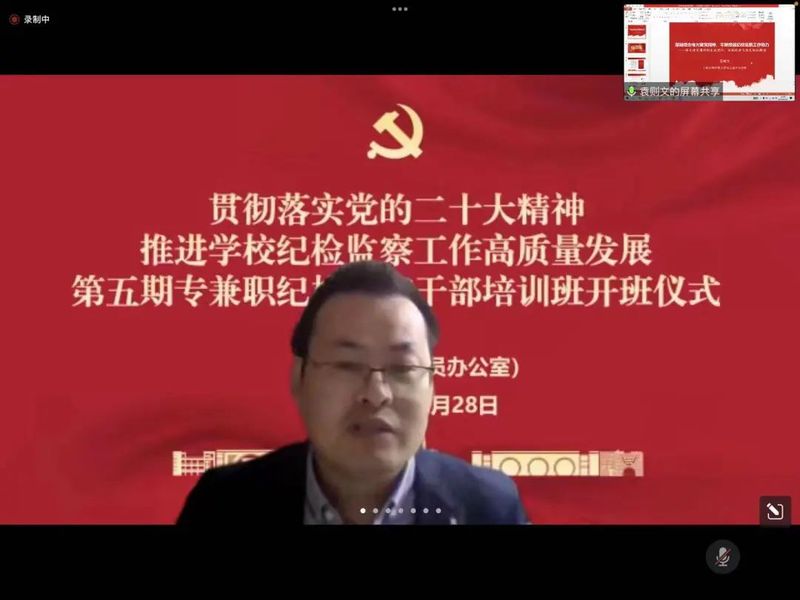 为深入贯彻落实党的二十大精神,建设忠诚干净担当、敢于善于斗争的纪检监察干部队伍,推动学校纪检监察工作高质量发展,学校第五期专兼职纪检监察干部培训班于10月28日下午以线上会议形式开班。校纪委副书记徐佳作开班动员,校纪委综合办主任姚福生主持开班式。学校纪委委员、专职纪检监察干部、二级单位党组织纪检委员、二级纪委书记和纪委委员、基层党支部纪检委员共100多人参加本次培训。