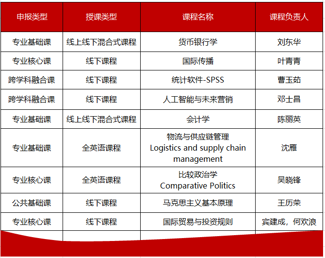 根据上海市教委发布的《上海市教育委员会关于公布2023年度上海高校市级一流本科课程认定结果的通知》(沪教委高〔2024〕2号),我校申报的《货币银行学》等9门课程荣获2023年度上海高校市级一流本科课程认定,覆盖专业基础课、专业核心课、跨学科融合课、公共基础课四大类别。
