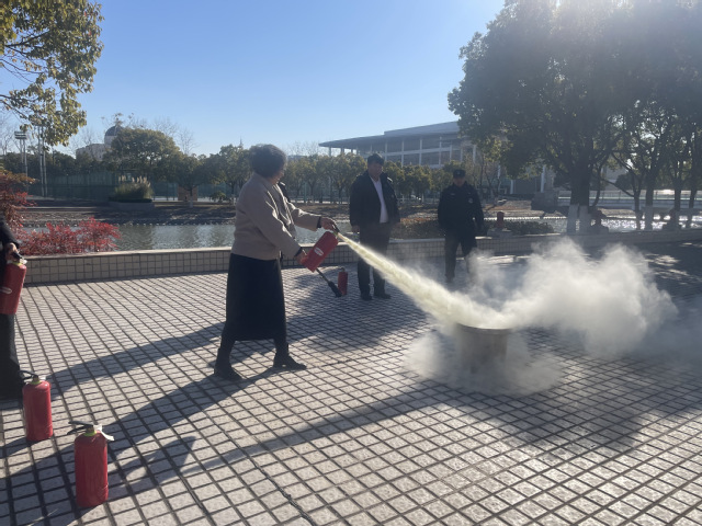在保卫处老师的指导下,大家在室外空旷场地现场学习如何正确使用灭火器。