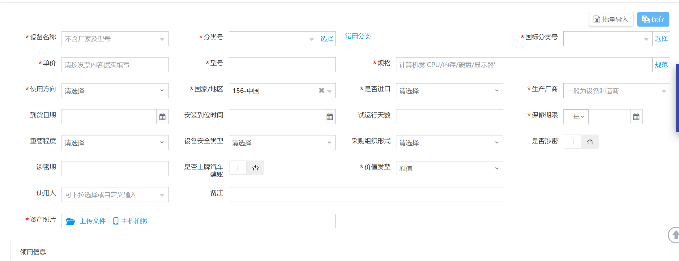 资产管理部门可以直接修改领用人信息,进行单台修改和批量修改操作。