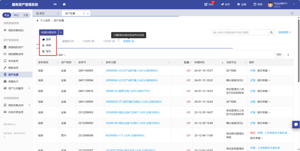 教职工登录系统台,点击【处置业务】,找到要撤回的退库业务点击【撤回】,如图所示;