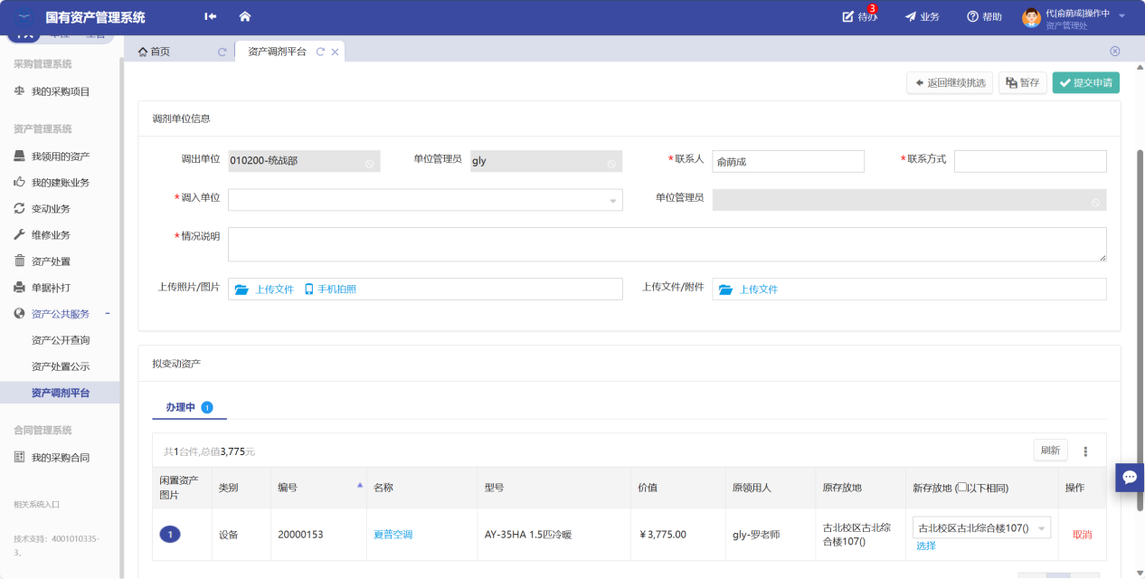 第三步:在业务提交页面,填写调剂信息,其中带“*”为必填项,确认资产列表中的设备信息,点击【提交申请】,如下图所示: