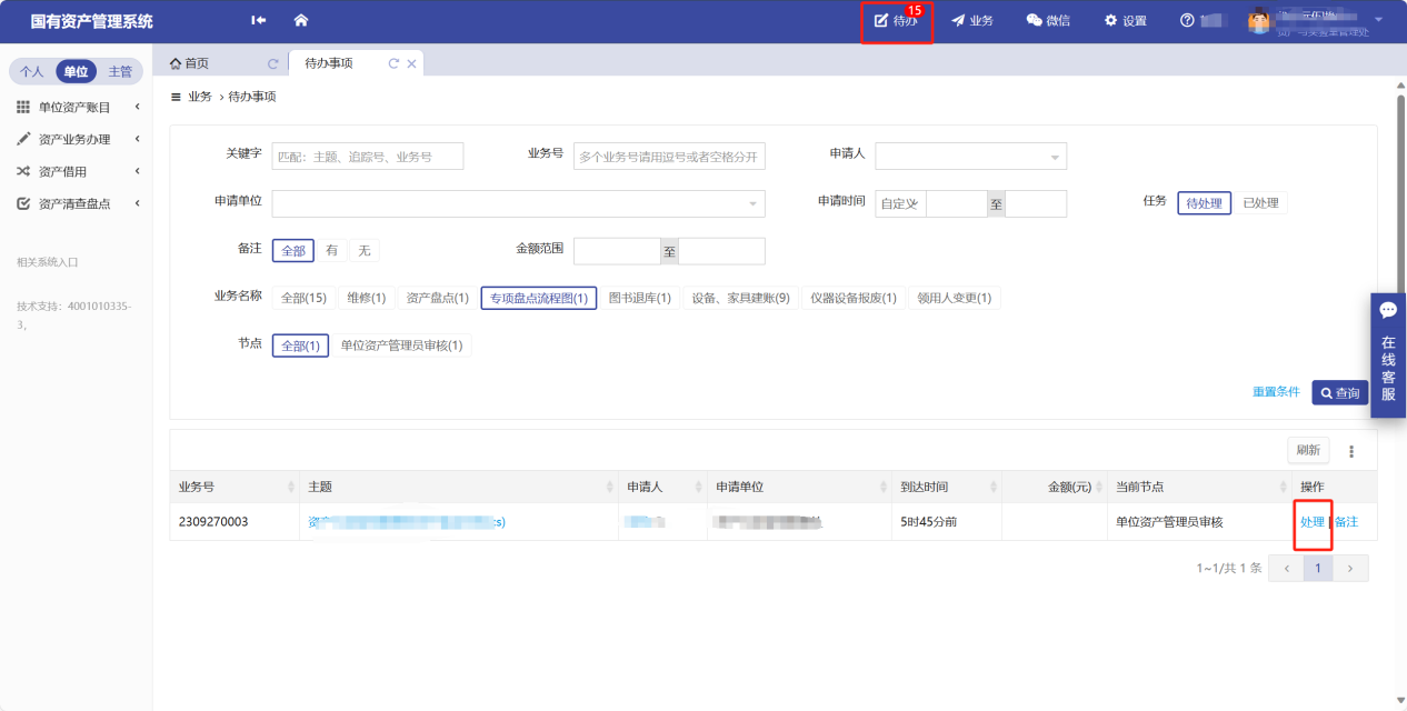 点击待办,可以看到接收到资产与实验室管理处发布的盘点任务,点击【处理】,进入盘点任务: