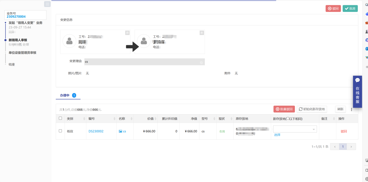 新领用人登录平台后,点击【待办】,进入待审业务页面,查看领用人变更业务,点击【处理】,进入审核页面核信息,填写新存放地,核对完成点击批准,如图: