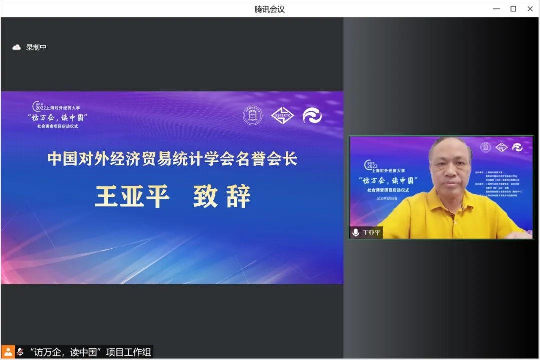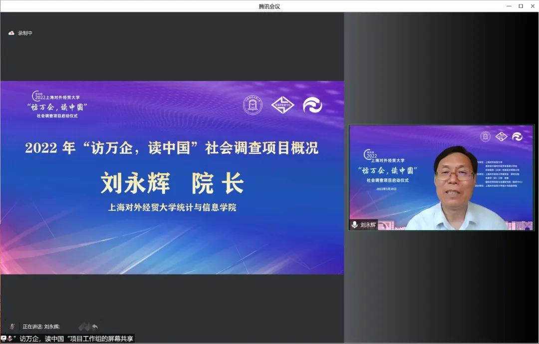 会上播放了本次“访万企,读中国”社会调查项目启动短视频。“访万企,读中国”社会调查项目于2019年由上海对外经贸大学发起,由上海对外经贸大学、中国对外经济贸易统计学会和环球慧思(北京)信息技术有限公司等单位共同组织实施,上海对外经贸大学统计与信息学院承办,连续三年分别围绕“优化营商环境,助推外贸企业转型升级”“新冠肺炎疫情下外贸企业的数字化转型”“聚焦贸易数字化,助力长三角一体化高质量发展”主题,累计近900名师生深度走访和调查了近800家企业,开展接力跟踪式调查研究,形成了近百份调查报告,助推企业转型发展,服务贸易强国建设,为上海和国家相关部门提供决策参考,获新华社、人民网、光明日报等十余家媒体宣传报道,产生了广泛的社会影响。