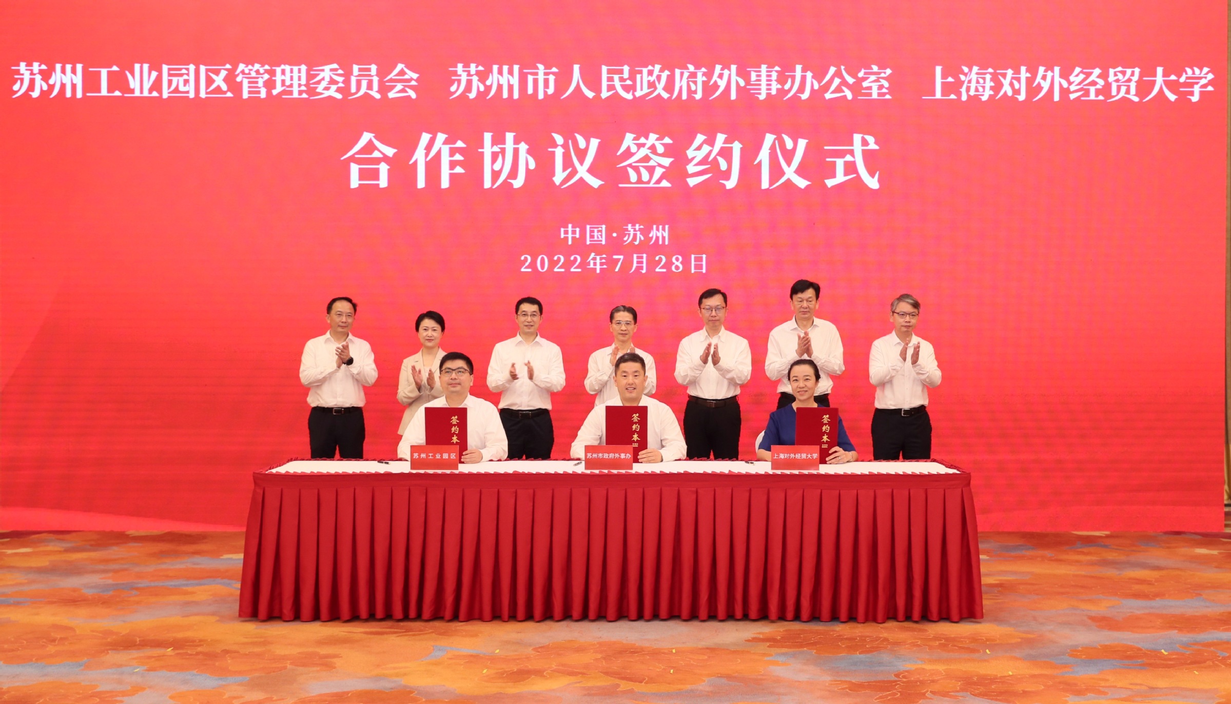 7月28日,全国政协常委、民建中央副主席周汉民,校长汪荣明,校党委副书记、副校长祁明,副校长于雪梅一行出席学校与苏州市政府战略合作签约仪式。上海对外经贸大学苏州工业园区自由贸易试验区协同创新中心、涉外人才培养基地及上海对外经贸大学全球经贸治理金鸡湖研究院三个共建平台同步揭牌。签约前,江苏省委常委、苏州市委书记曹路宝会见了周汉民、汪荣明一行。苏州市委副书记、市长吴庆文,市委常委、工业园区党工委书记沈觅,市委常委、市委秘书长潘国强,副市长季晶,市政府秘书长陈羔等领导出席签约揭牌等活动。