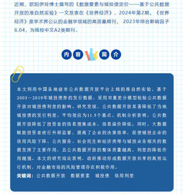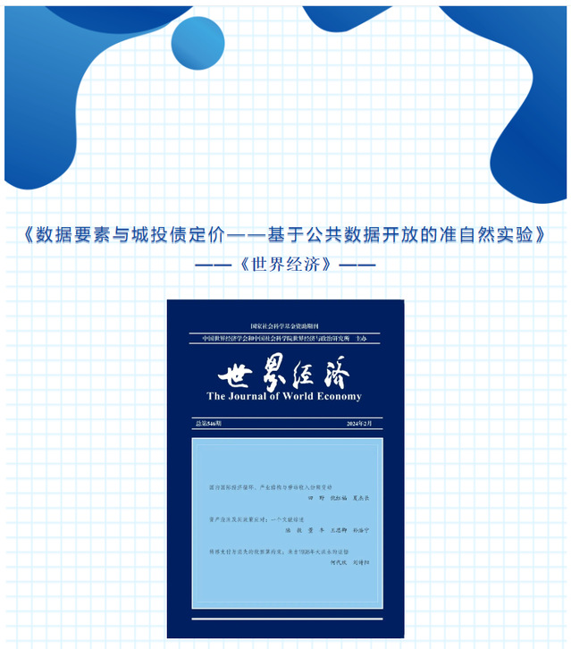 学术前沿|我校欧阳伊玲博士论文《数据要素与城投债定价——基于公共数据开放的准自然实验》在《世界经济》发表