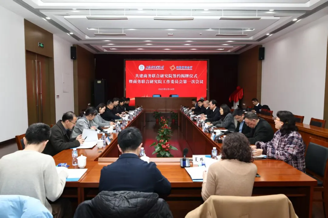 仪式上,孙东海、汪荣明代表厅校双方签署“商务联合研究院”共建协议,并为研究院揭牌。